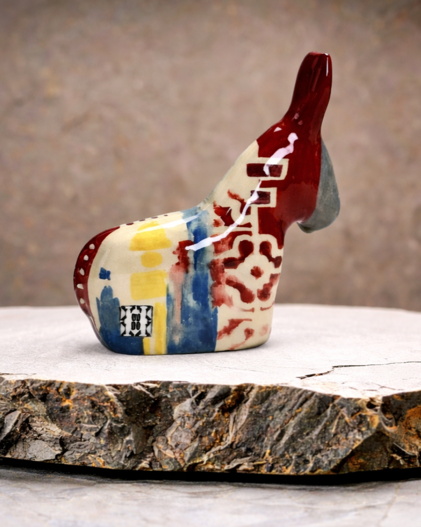 The donkey exists as both art and object — a sculpture shaped by the artist and a symbol carried through everyday pieces.